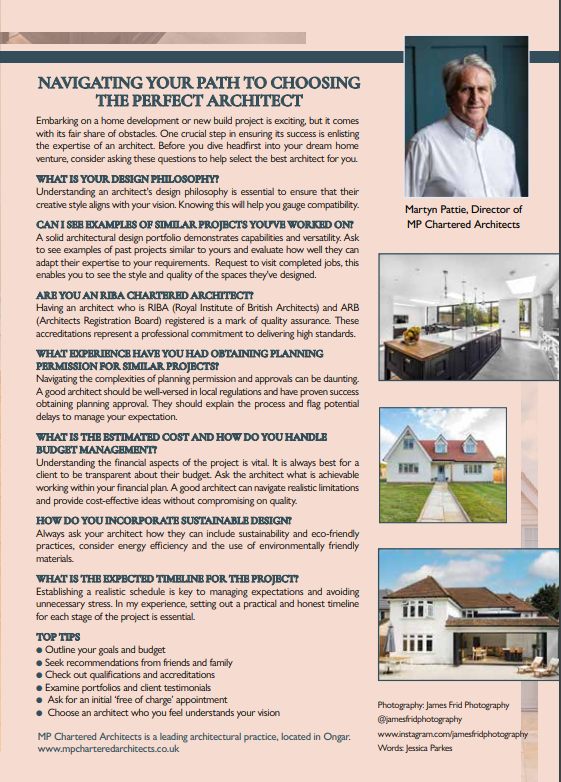 We are delighted to feature in the most recent issue of @Vision Magazine Essex Martyn Pattie helps Essex homeowners on how to navigate choosing the perfect Architect for your home development project. Read More