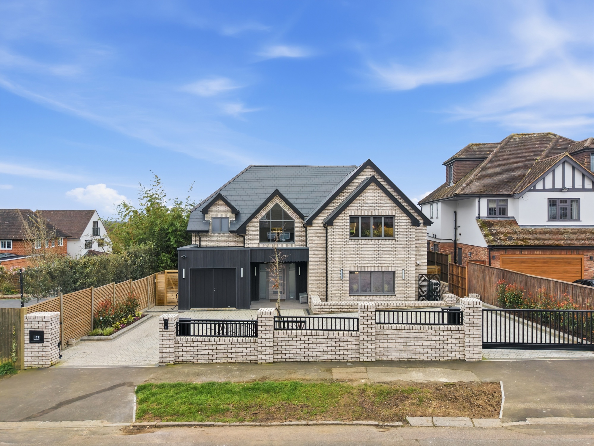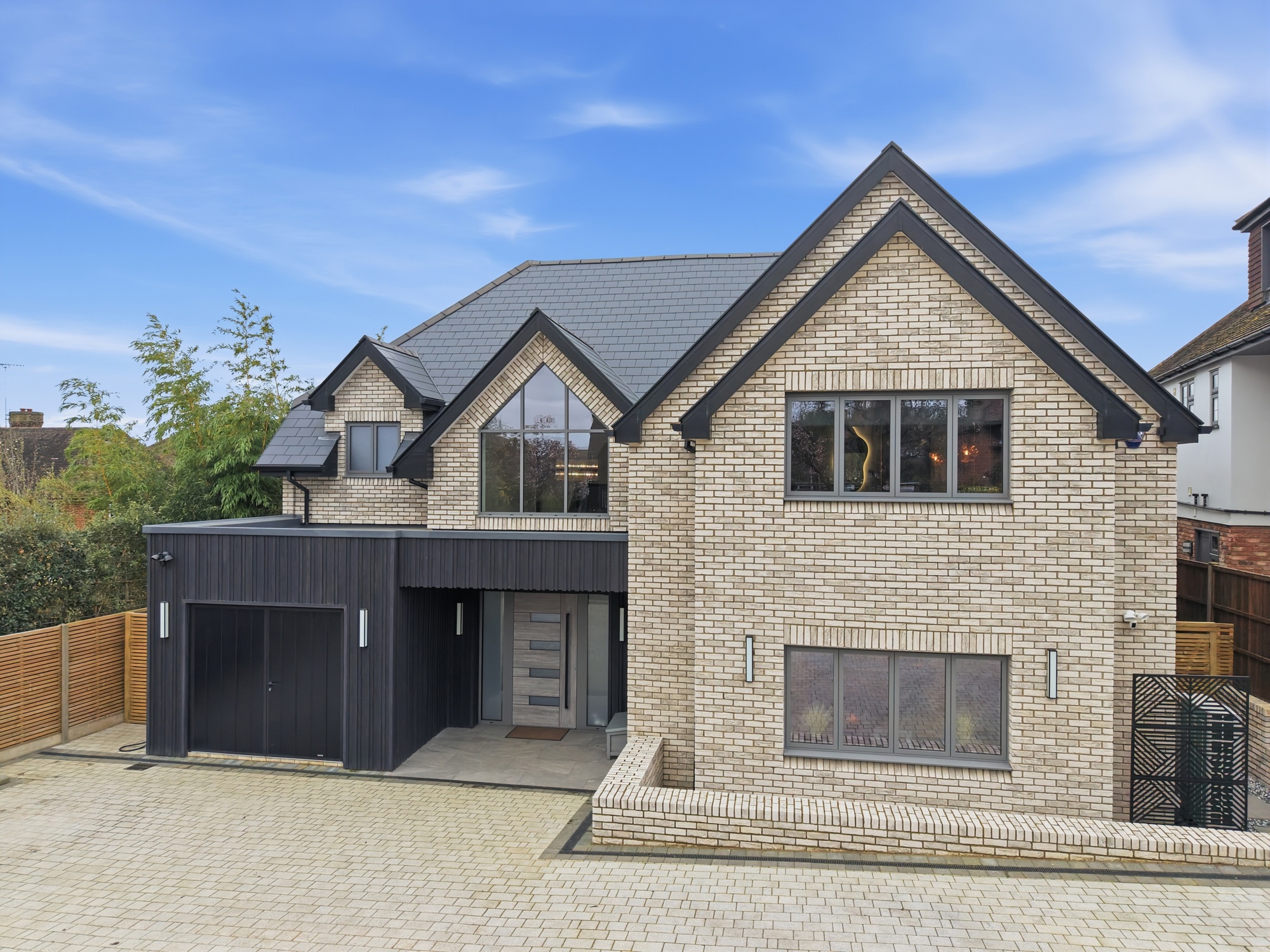 Architecturally, the design of the house balances a light-toned brick façade with contrasting dark cladding elements, creating a clean and contemporary appearance. Large openings and carefully considered proportions maximise natural light and enhance the overall presence of the building.