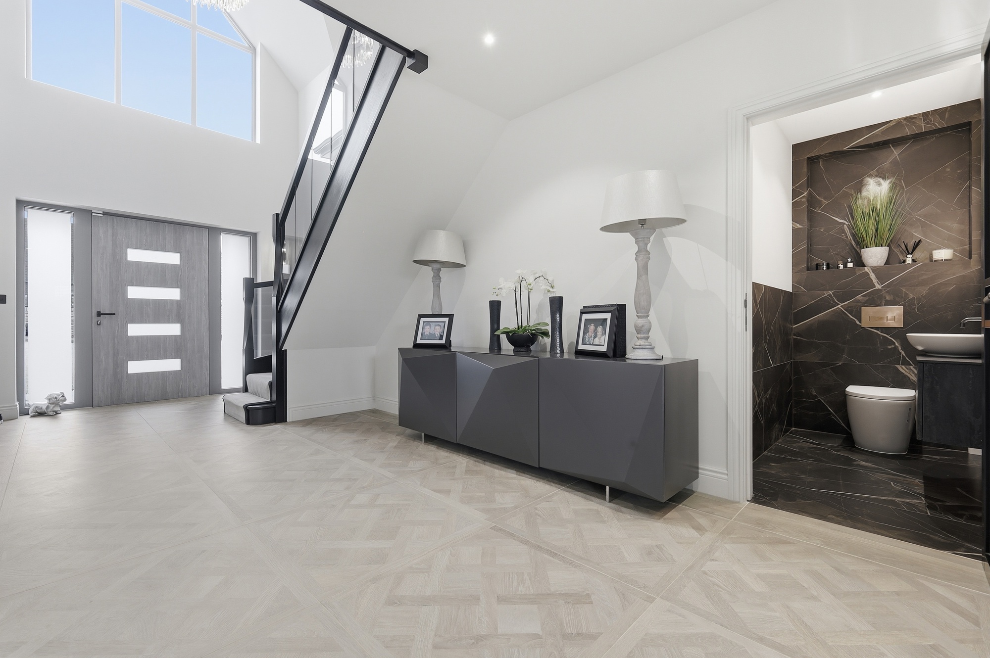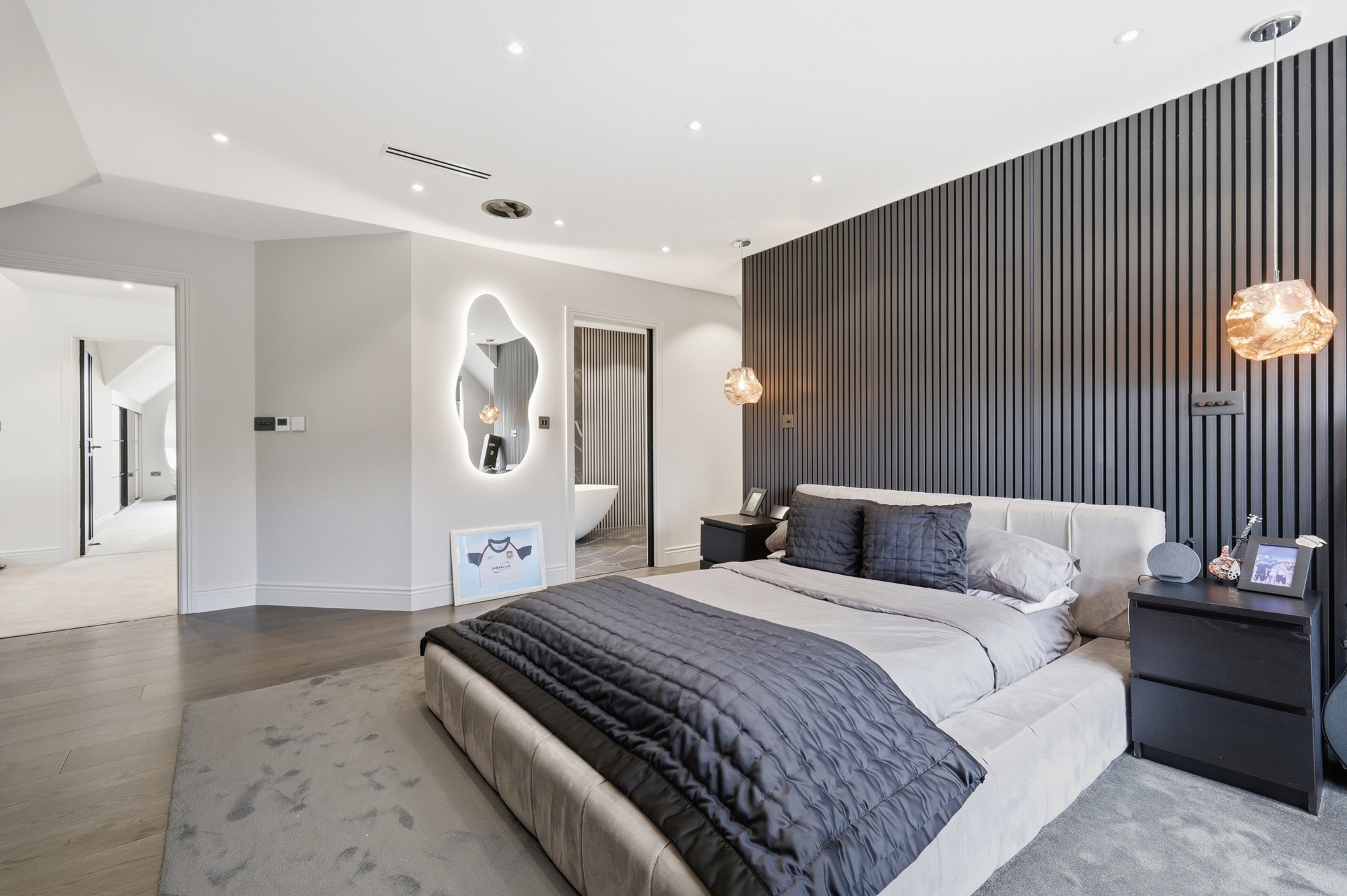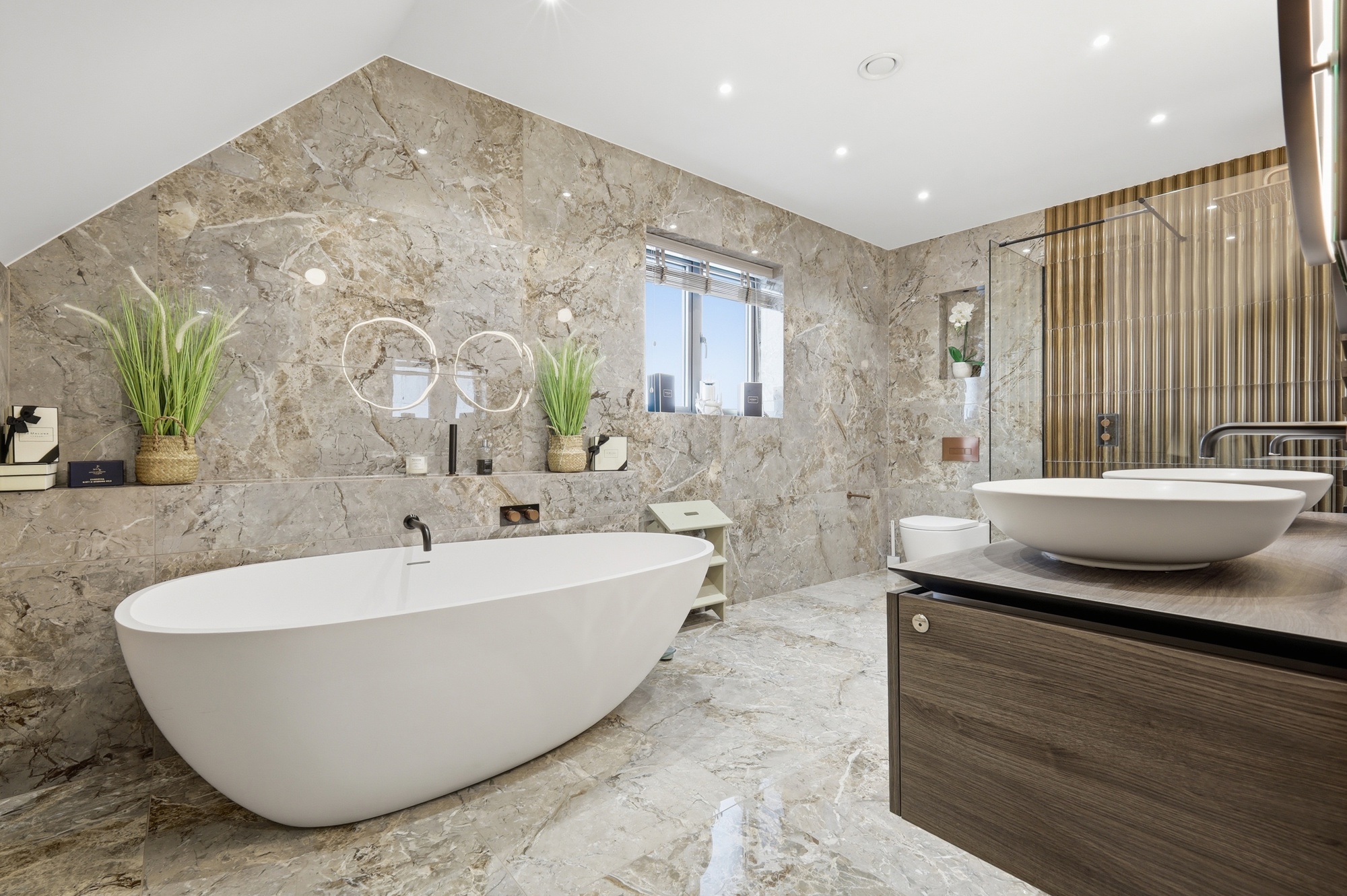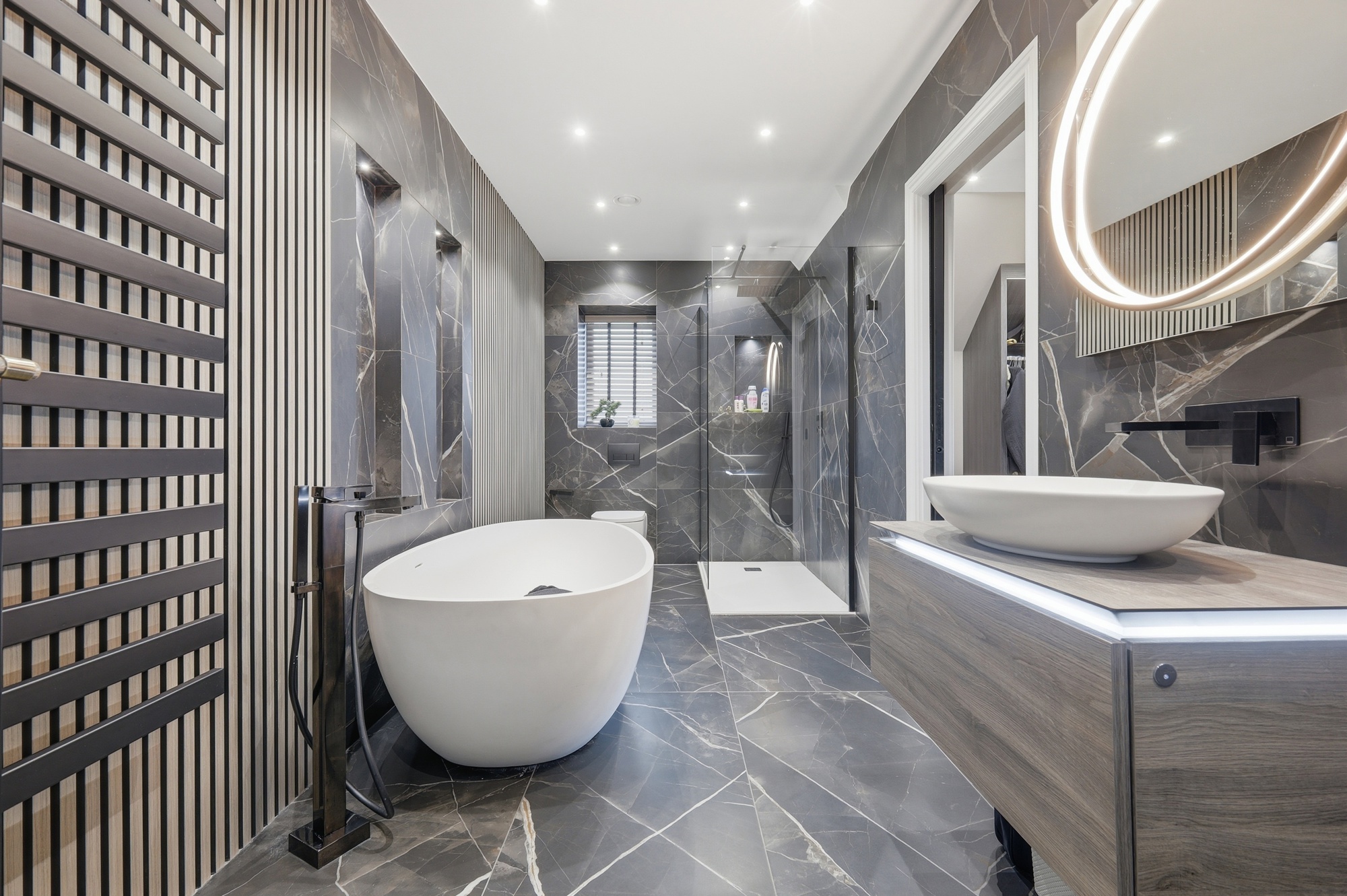 Throughout the home, bespoke elements such as walk-in wardrobes, feature wall panelling, and integrated lighting have been used to create a cohesive and high-quality interior. The bathrooms and en-suites are luxurious, spa-like spaces which include freestanding baths, full-height marble finishes, and high-end sanitaryware.