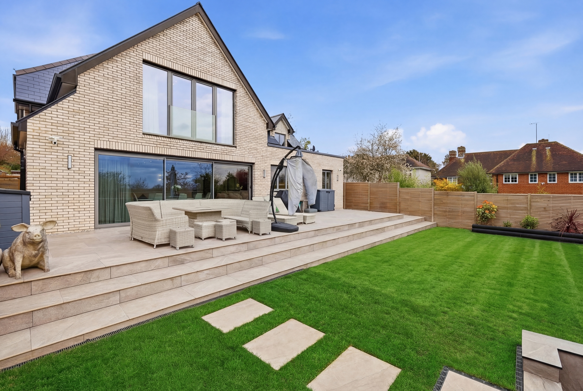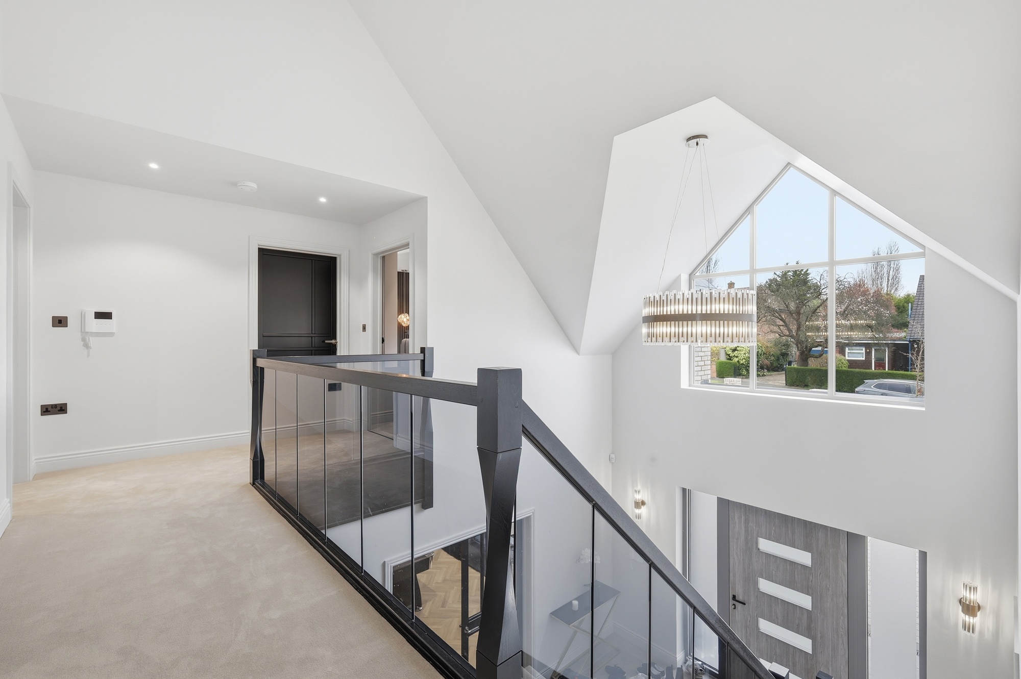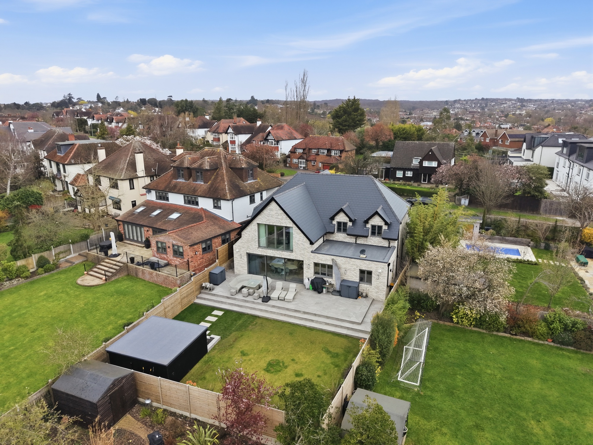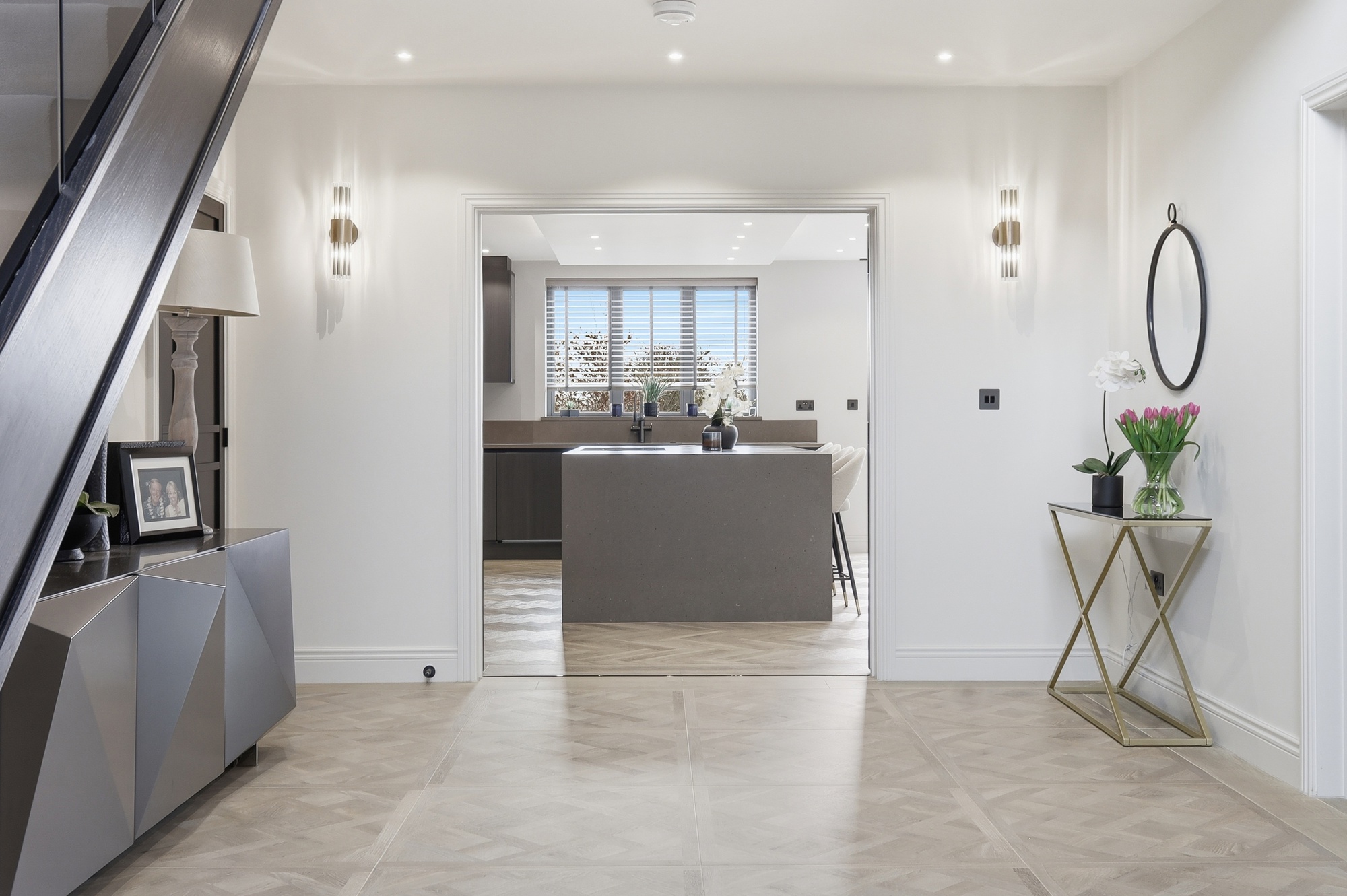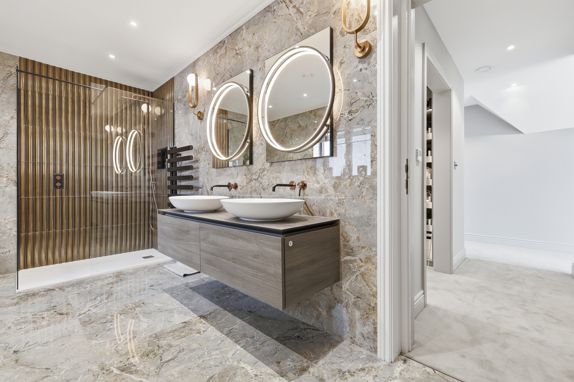 Throughout the home, bespoke elements such as walk-in wardrobes, feature wall panelling, and integrated lighting have been used to create a cohesive and high-quality interior. The bathrooms and en-suites are luxurious, spa-like spaces which include freestanding baths, full-height marble finishes, and high-end sanitaryware.