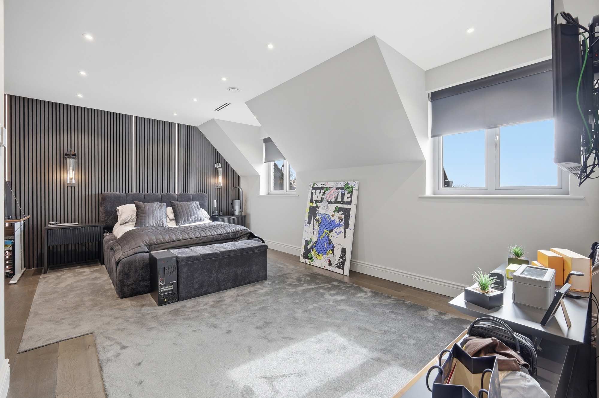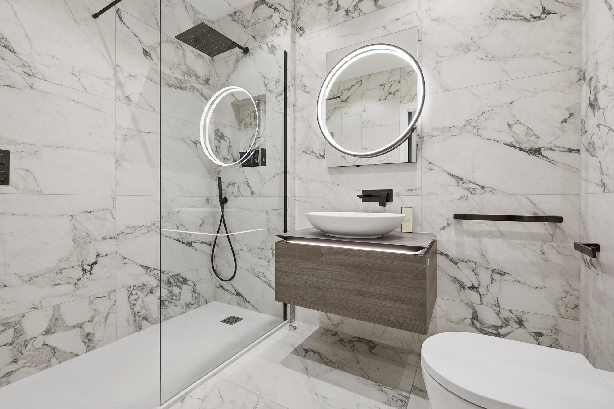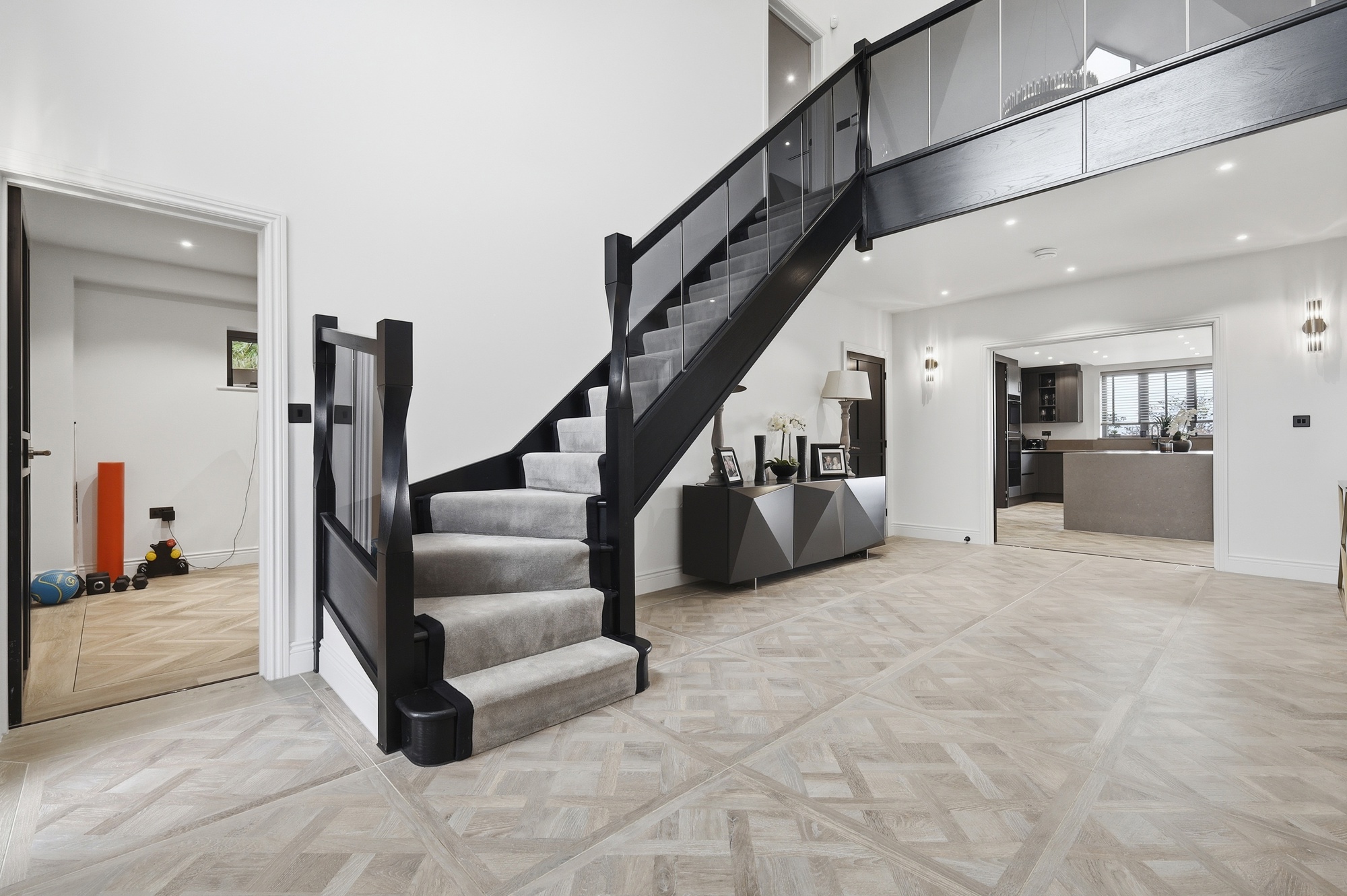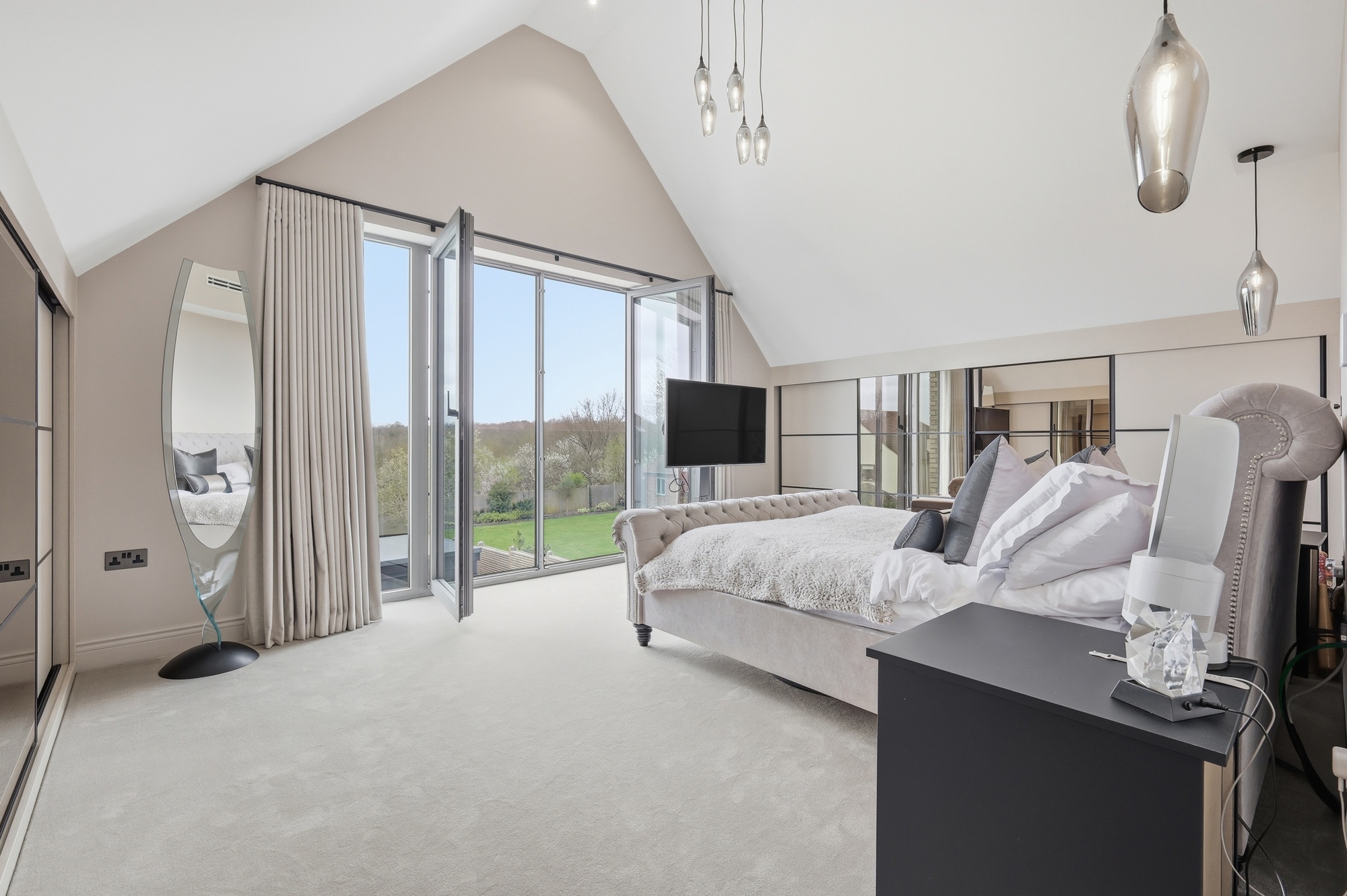 Throughout the home, bespoke elements such as walk-in wardrobes, feature wall panelling, and integrated lighting have been used to create a cohesive and high-quality interior. The bathrooms and en-suites are luxurious, spa-like spaces which include freestanding baths, full-height marble finishes, and high-end sanitaryware.