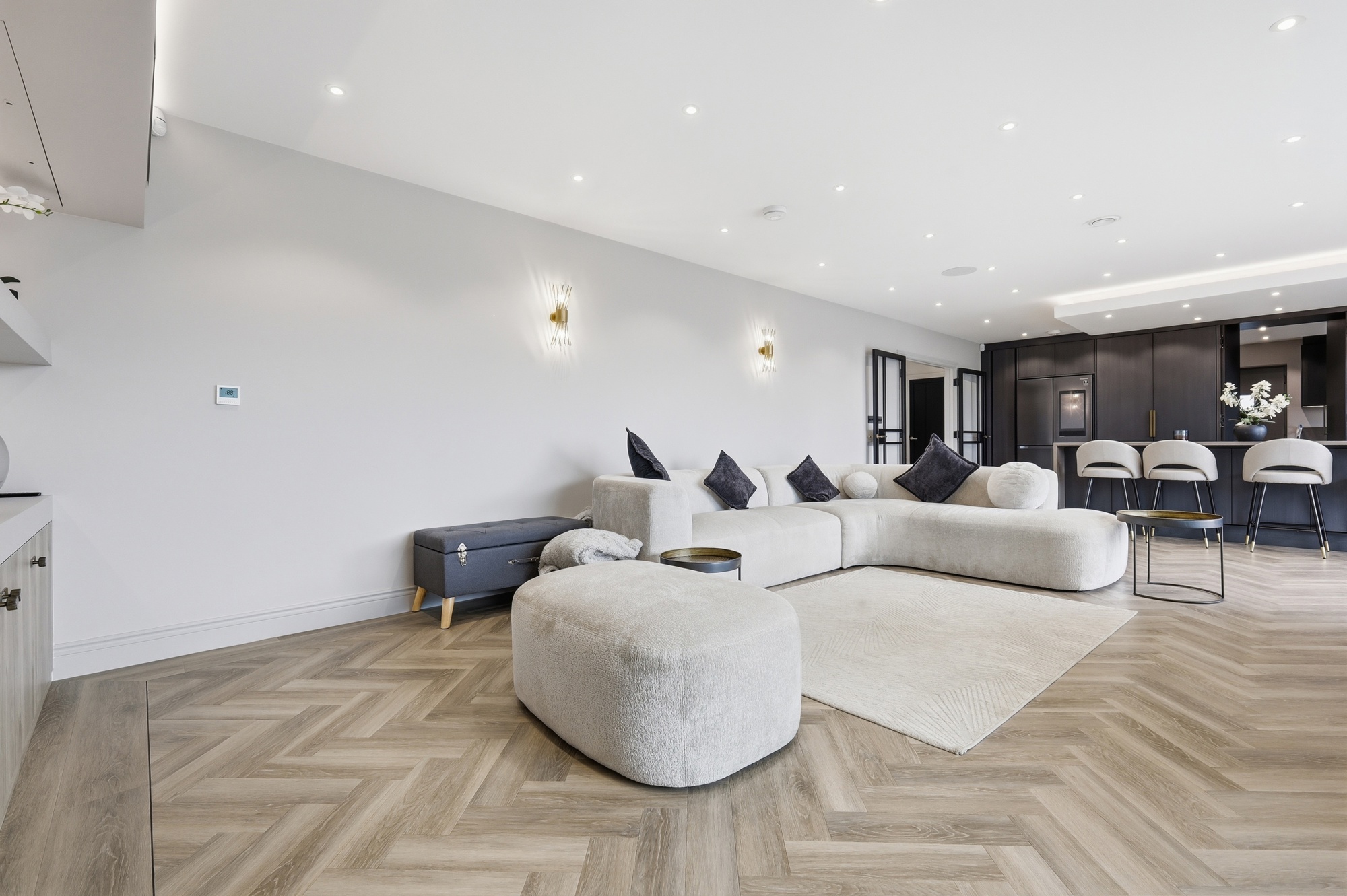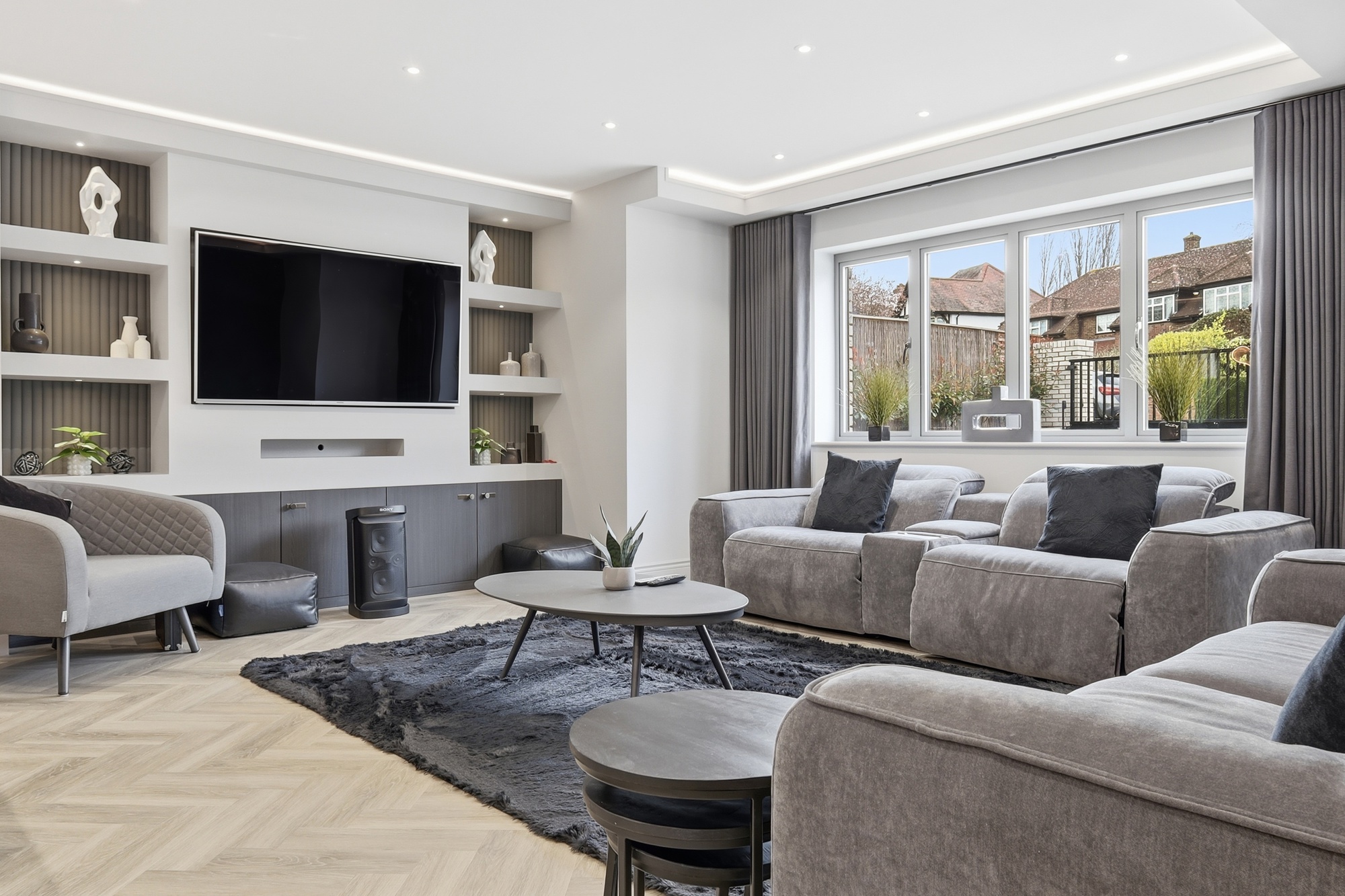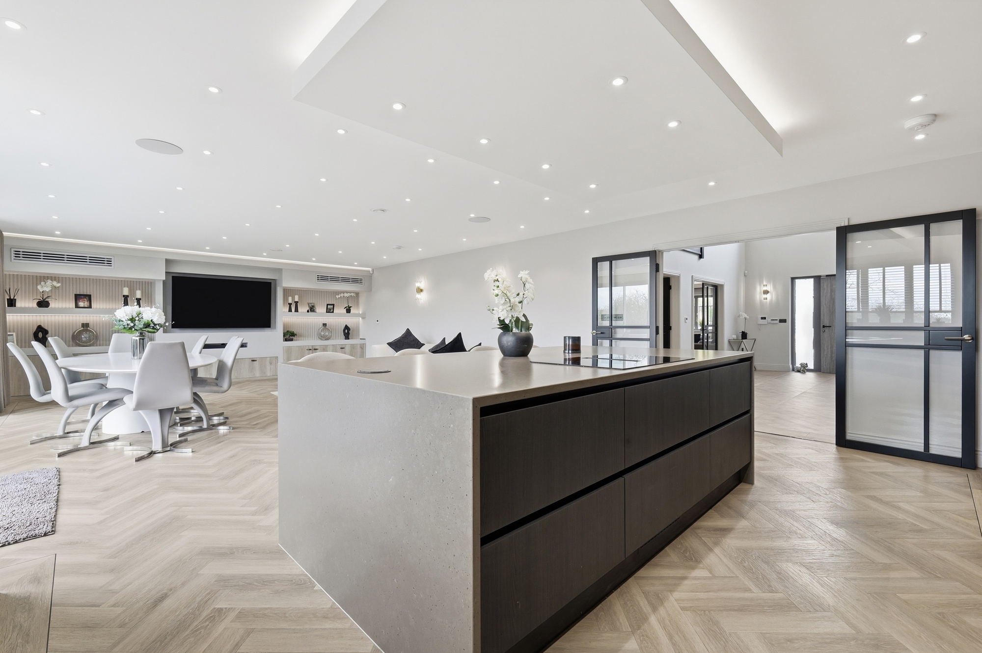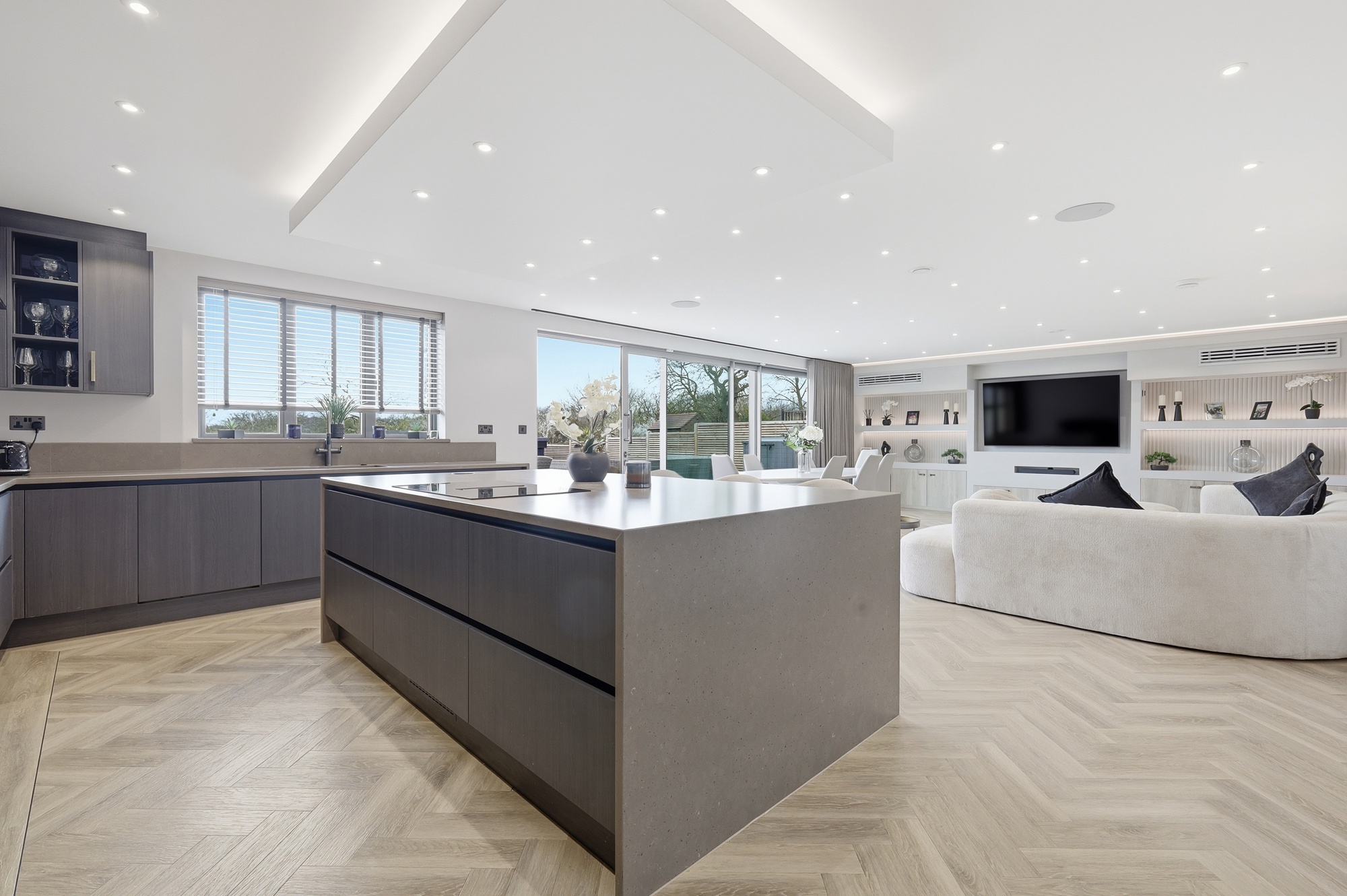 The home has been designed with practicality in mind. A bespoke kitchen with integrated Siemens appliances forms the heart of the home, featuring a large island and hidden utility room. The living area boasts a custom media wall with integrated lighting and hidden services, creating a seamless and modern focal point.