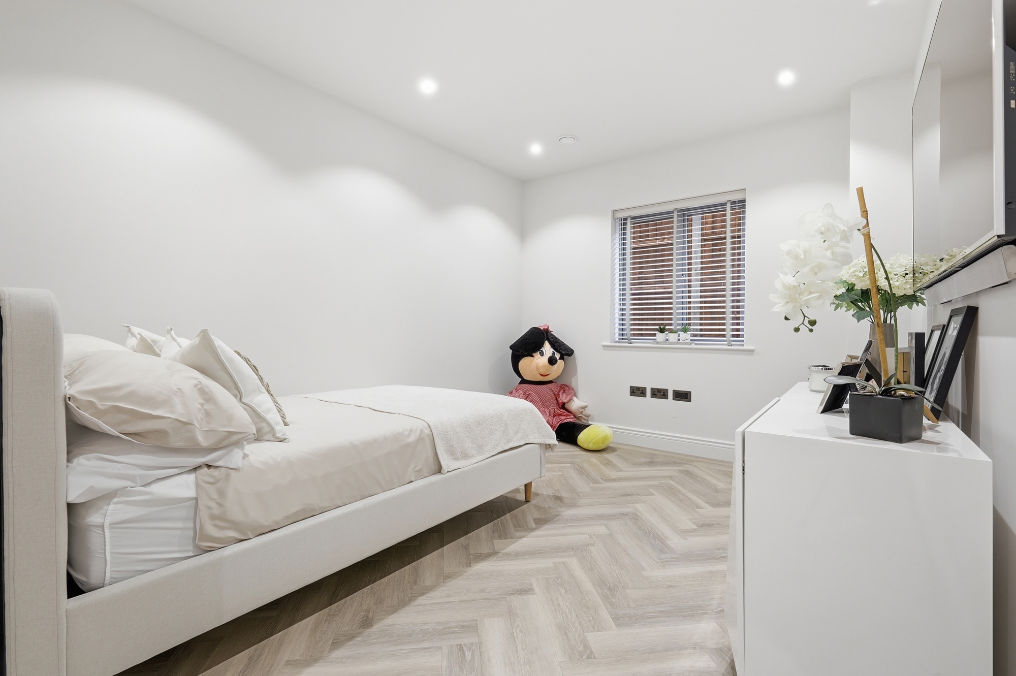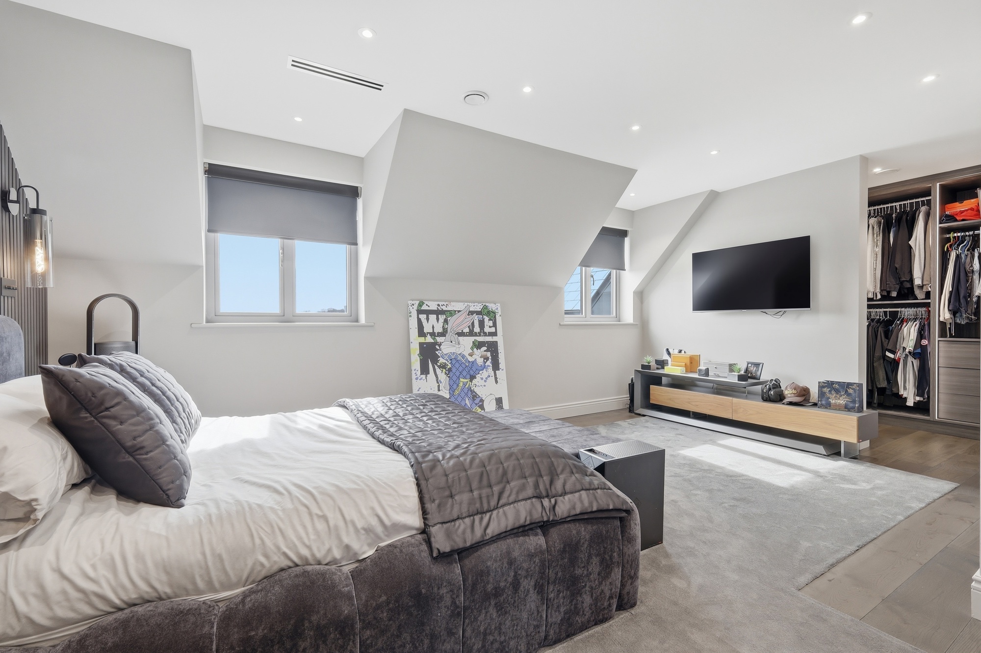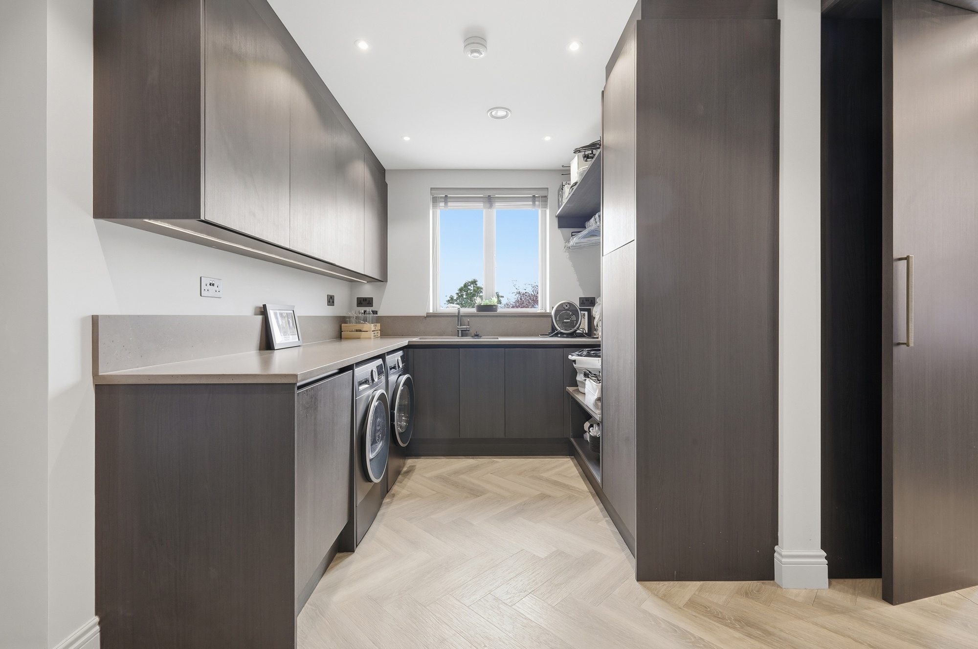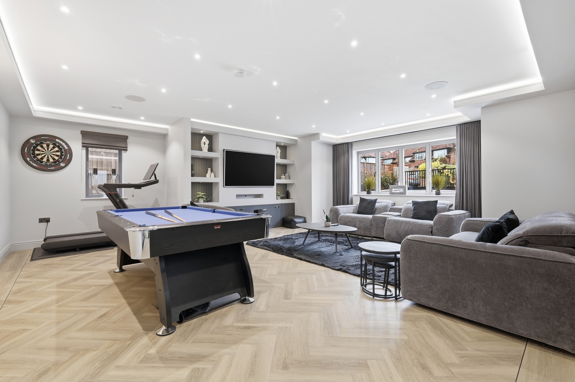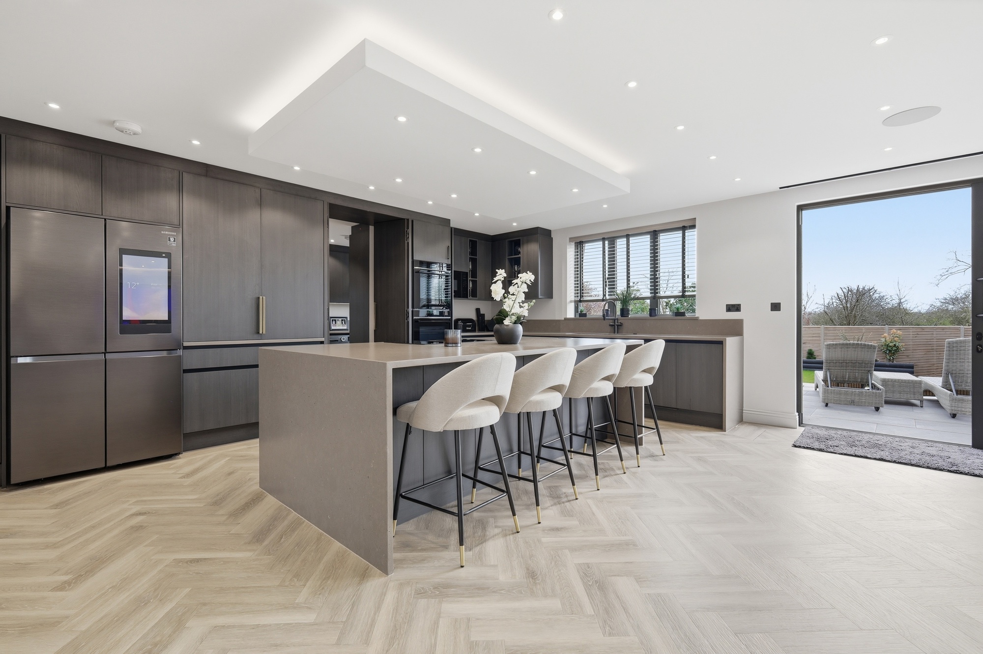 The home has been designed with practicality in mind. A bespoke kitchen with integrated Siemens appliances forms the heart of the home, featuring a large island and hidden utility room. The living area boasts a custom media wall with integrated lighting and hidden services, creating a seamless and modern focal point.
